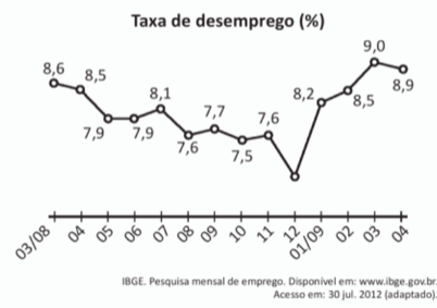 O gráfico apresenta a taxa de desemprego (em%) para o período de março de 2008 a abril de 2009, obtida com base nos dados observados nas regiões metropolitanas de Recife, Salvador, Belo Horizonte, Rio de Janeiro, São Paulo e Porto Alegre.