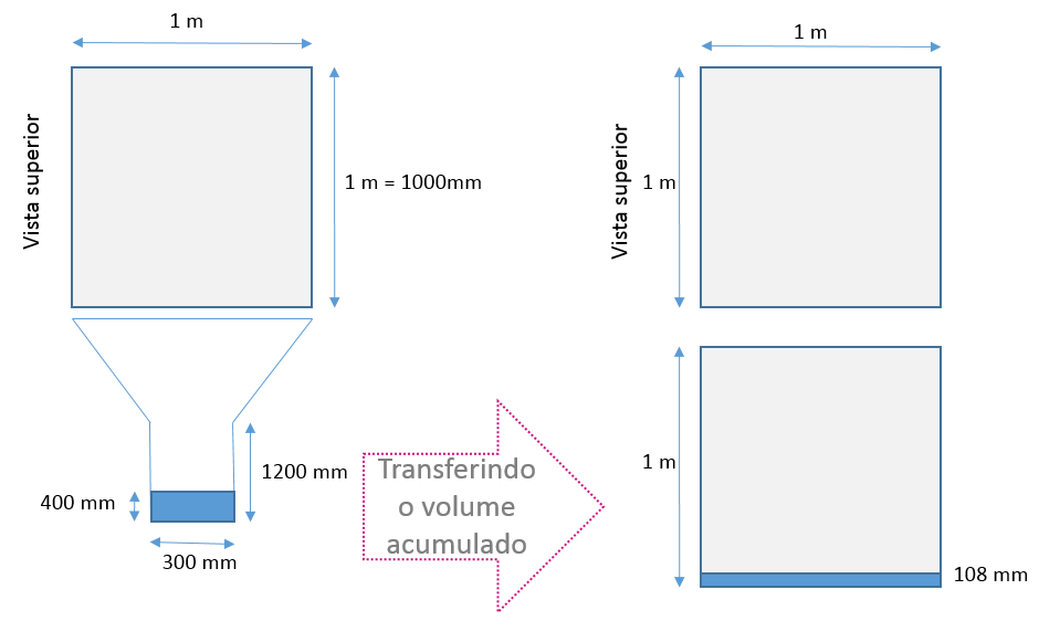 Este é o volume da chuva que caiu ma lata. Se colocarmos esse mesmo líquido em um cubo de 1 m de aresta (1000 mm), poderemos calcular qual altura esse volume teria no cubo fazendo uma igualdade entre os dois volumes.