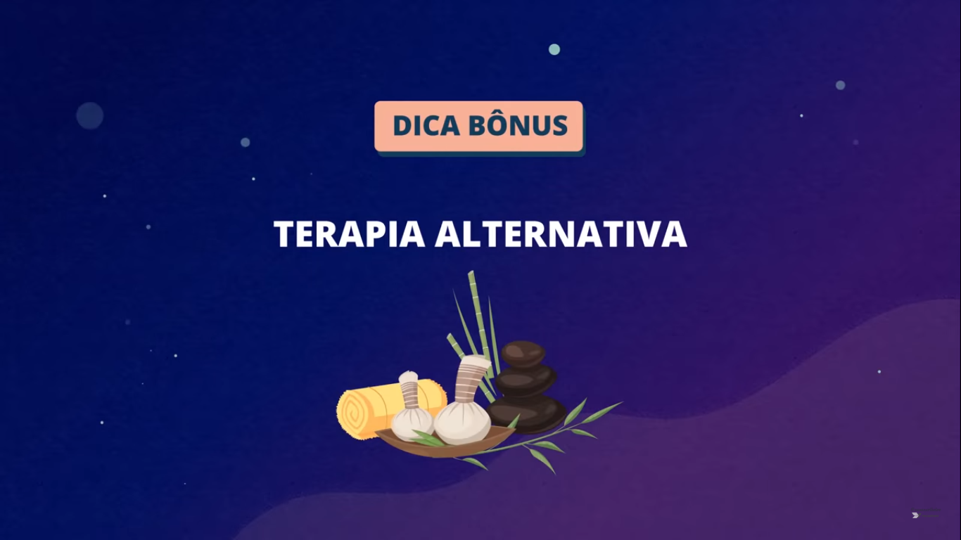 Um bônus, além de tudo que eu falei, vai ser fazer alguma terapia alternativa. Por exemplo, acupunturara, massagem, ou conversar com um psicólogo. Eu, por exemplo, gosto muito de acupunturara, ultimamente está sendo sensacional na minha, além de fazer yoga também. Então fica a ideia de alguma terapia alternativa para você fazer quando mais precisar.