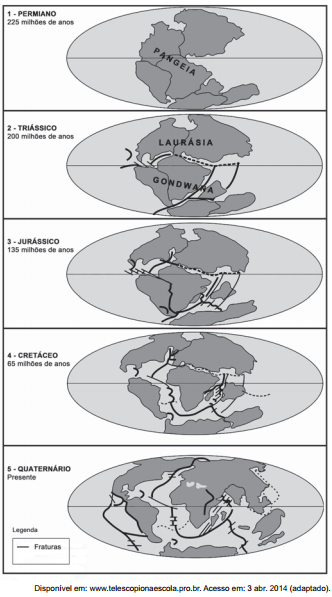 A partir da análise da imagem, o aparecimento da Dorsal Mesoatlântica está associada ao(à) a) separação da Pangeia a partir do período Permiano. b) deslocamento de fraturas no período …