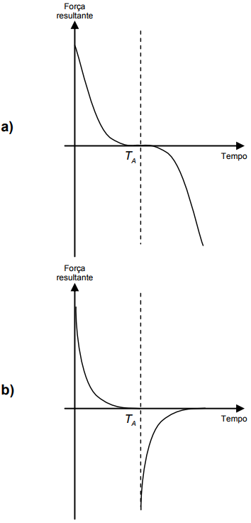 Em um dia sem vento, ao saltar de um avião, um paraquedista cai verticalmente até atingir a velocidade limite. No instante em que o paraquedas é aberto (instante TA), ocorre a diminuição de sua …