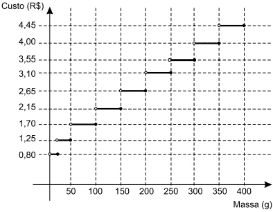 Deseja-se postar cartas não comerciais, sendo duas de 100 g, três de 200 g e uma de 350 g. O gráfico mostra o custo para enviar uma carta não comercial pelos …