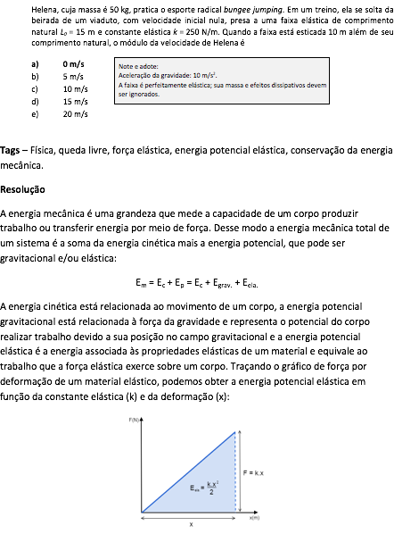 Helena, cuja massa é 50 kg, pratica o esporte radical bungee jumping. Em um treino, ela se solta da beirada de um viaduto, com velocidade inicial nula, presa a uma faixa elástica de comprimento …