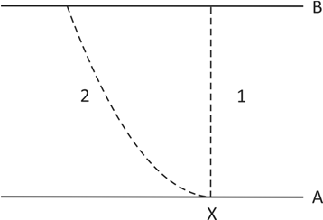 Na figura, A e B representam duas placas metálicas; a diferença de potencial entre elas é VB – VA = 2,0 x 104 V. As linhas tracejadas 1 e 2 representam duas possíveis trajetórias de um elétron, no …