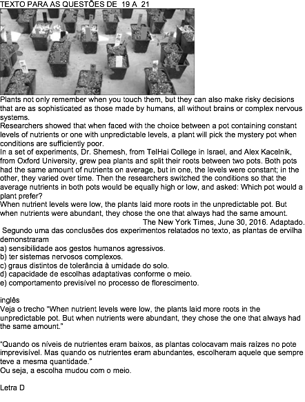 TEXTO PARA AS QUESTÕES DE 19 A 21 Plants not only remember when you touch them, but they can also make risky decisions that are as sophisticated as those made by humans, all without brains or …