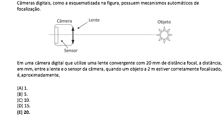 Câmeras digitais, como a esquematizada na figura, possuem mecanismos automáticos de focalização. Em uma câmera digital que utilize uma lente convergente com 20 mm de distância focal, a distância, …
