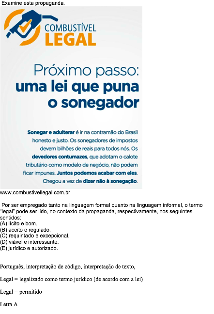 Examine esta propaganda. www.combustivellegal.com.br Por ser empregado tanto na linguagem formal quanto na linguagem informal, o termo “legal” pode ser lido, no contexto da propaganda, …