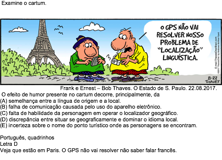 Examine o cartum. O GPS não vai resolver nosso problema de "localização" linguística. Frank e Ernest – Bob Thaves. O Estado de S. Paulo. 22.08.2017. O efeito de humor presente no cartum …