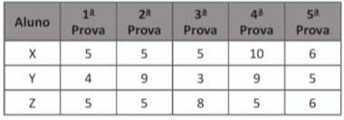 Três alunos, X, Y e Z, estão matriculados em um curso de inglês. Para avaliar esses alunos, o professor optou por fazer cinco provas. Para que seja aprovado nesse curso, o aluno deverá ter a média …