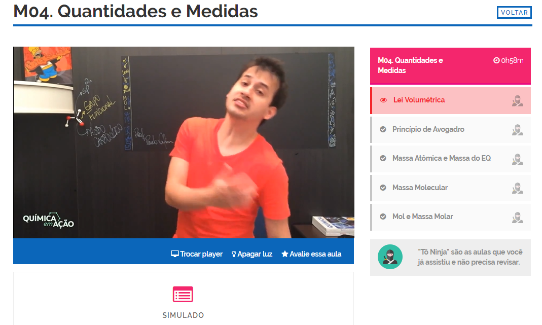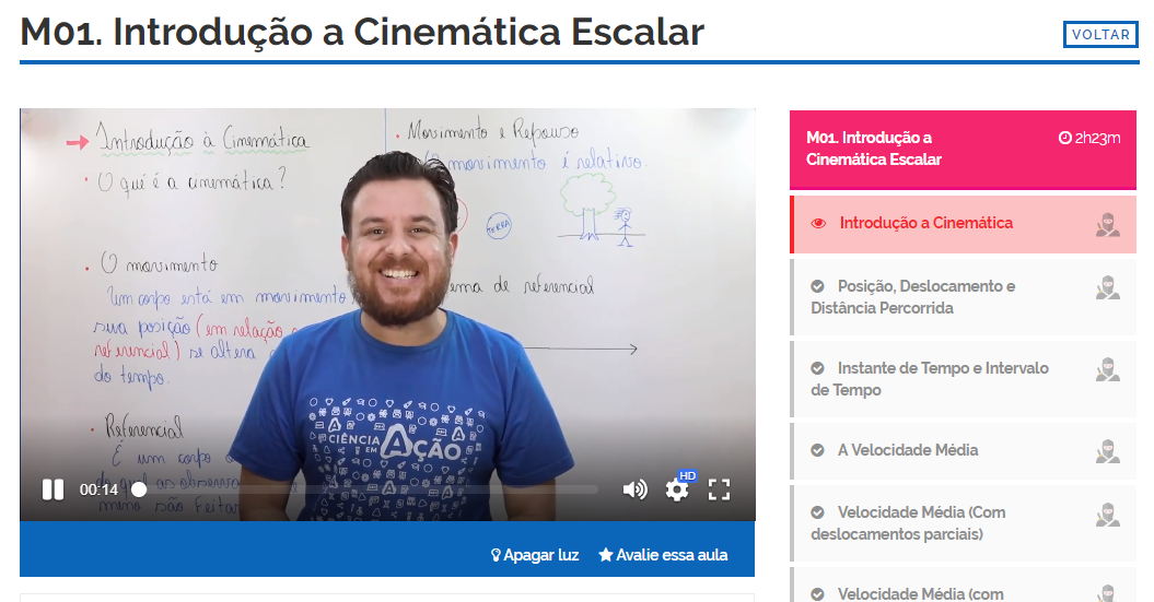 O curso conta com todos os assuntos de Física, Biologia e Química cobrados no ENEM e nos vestibulares mais concorridos do Brasil, com videoaulas ministradas por professores super reconhecidos. Você pode escolher a matéria que vai estudar, em seguida, abrem-se as opções de assuntos. Conforme você for assistindo às aulas, você vai dando um check em cada uma. Isso facilita a organização do seu plano de estudos, porque você sabe exatamente quais aulas já assistiu.