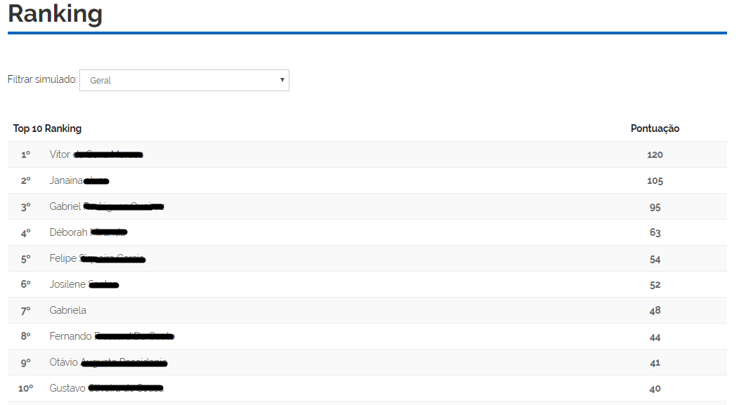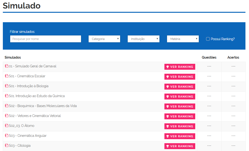 No curso do Ciência em Ação, tem um ranking baseado nas notas dos alunos nos simulados. Existe um ranking geral da plataforma toda, como também cada assunto possui um ranking próprio. Você pode ver os 10 primeiros colocados em cada ranking, além da sua classificação, mesmo que você não esteja entre os 10.