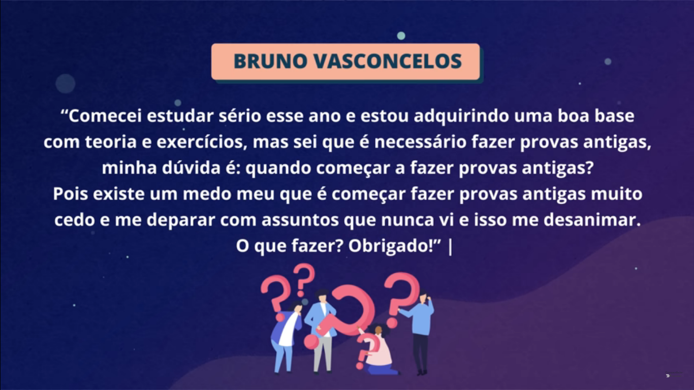 Hoje eu vou fazer um vídeo respondendo uma pergunta super comum, que pode ser a sua também, é a pergunta do Bruno Vasconcelos, que é a seguinte: comecei a estudar sério esse ano e estou adquirindo uma boa base com teorias e exercícios, mas sei que é necessário fazer provas antigas e minha dúvida é quando começar a fazer provas antigas? Pois existe um medo meu que é começar a fazer provas antigas muito cedo e me deparar com assuntos que nunca vi e isso me desanimar. O que fazer? obrigado. Então vamos responder essa pergunta e aproveita para curtir e se inscrever e roda a vinheta!