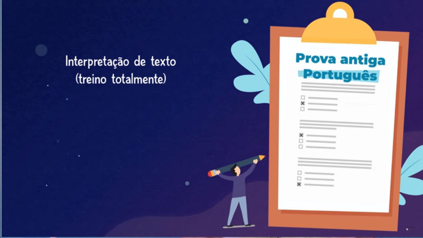 Vamos pensar em começar pelas provas de português, porque se você for olhar as questões de português você vai ver que a maioria é interpretação de texto, e interpretação de texto não tem muita teoria, então é treino totalmente.