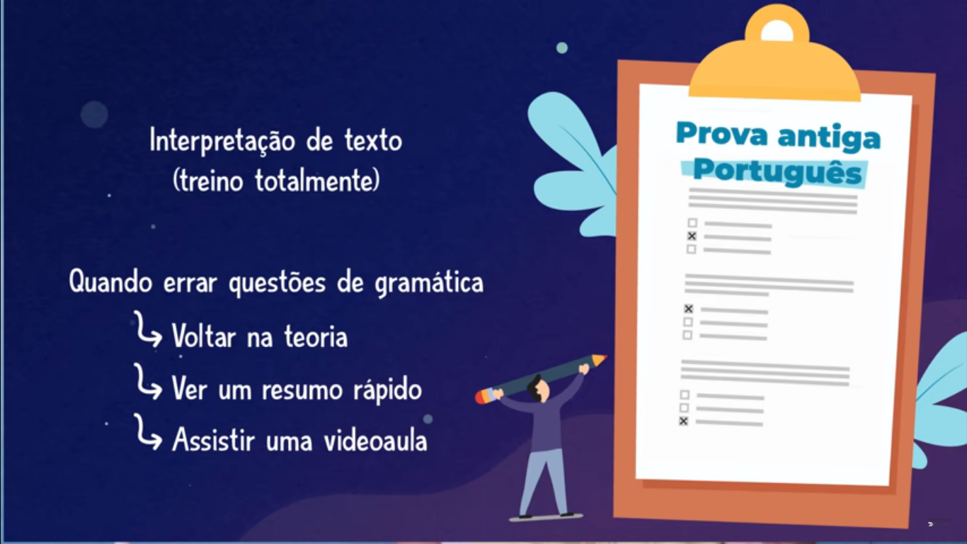A ideia vai ser pegar provas de português e começar a fazer logo, e aí quando você errar a interpretação, aprenda como fazer, veja qual foi o seu erro e o que você deveria ter feito para acertar; de acordo com a questão de gramática você pode voltar na teoria da gramática antes, você pode ver um resumo rápido e fazer a questão e assim você já vai ficando super bem preparado para português, você não espera o segundo semestre, não espera um mês antes da prova para ficar bem.
