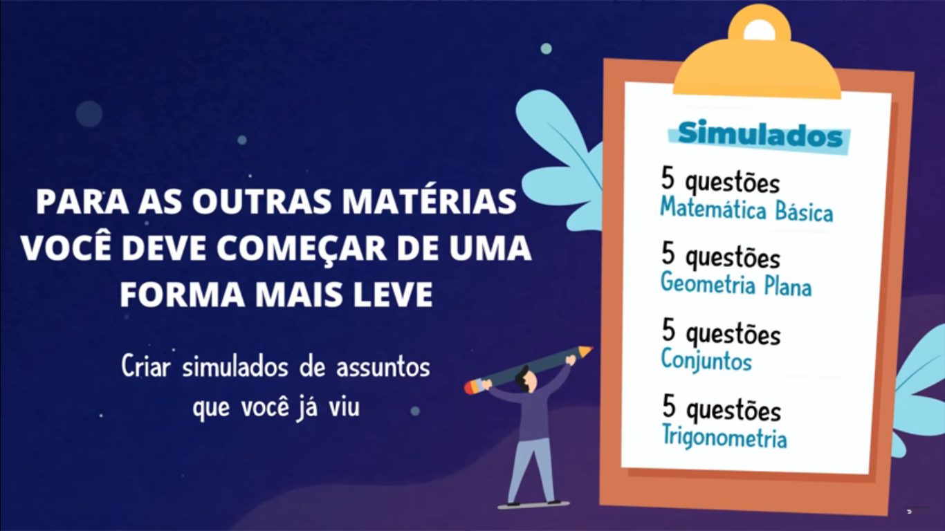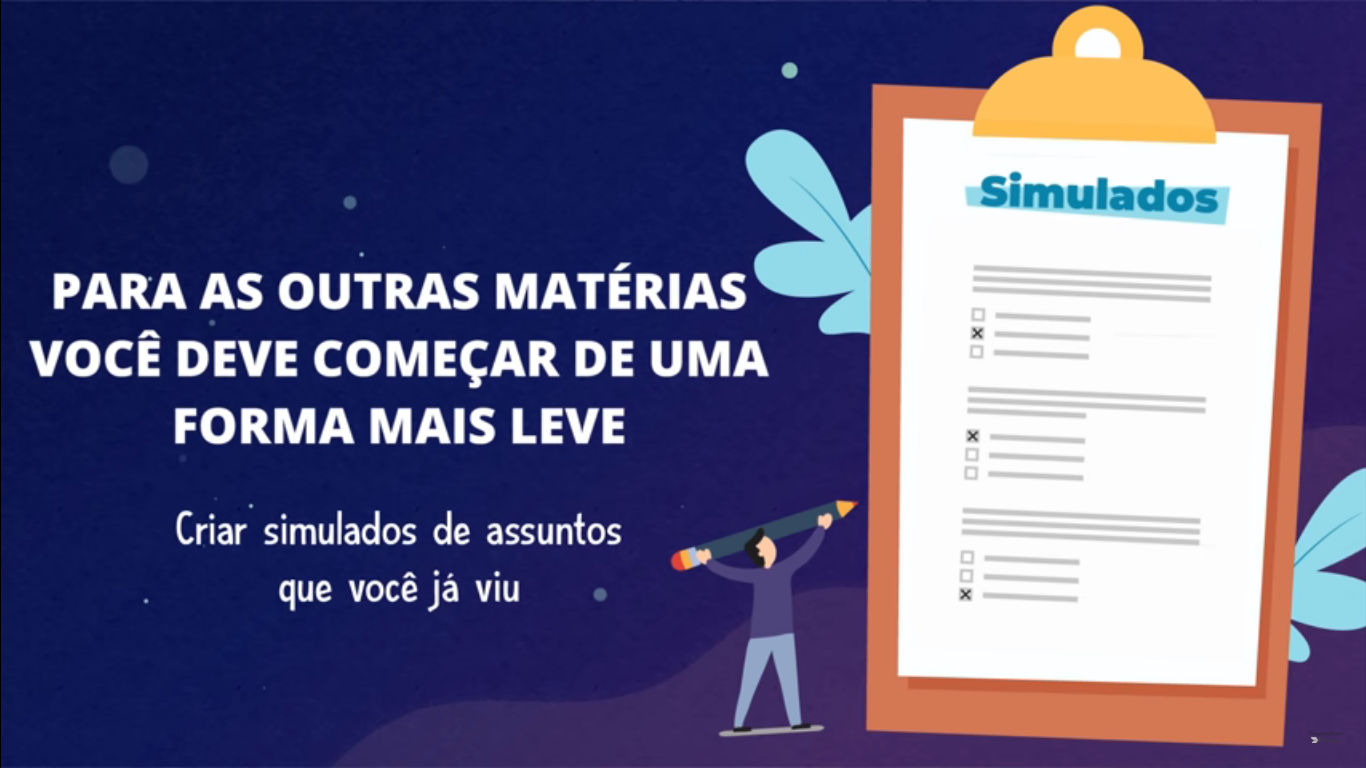 Já nas outras matérias vamos começar de uma forma mais leve! A ideia vai ser começar com simulados, você vai criar simulados dos assuntos que você já viu.