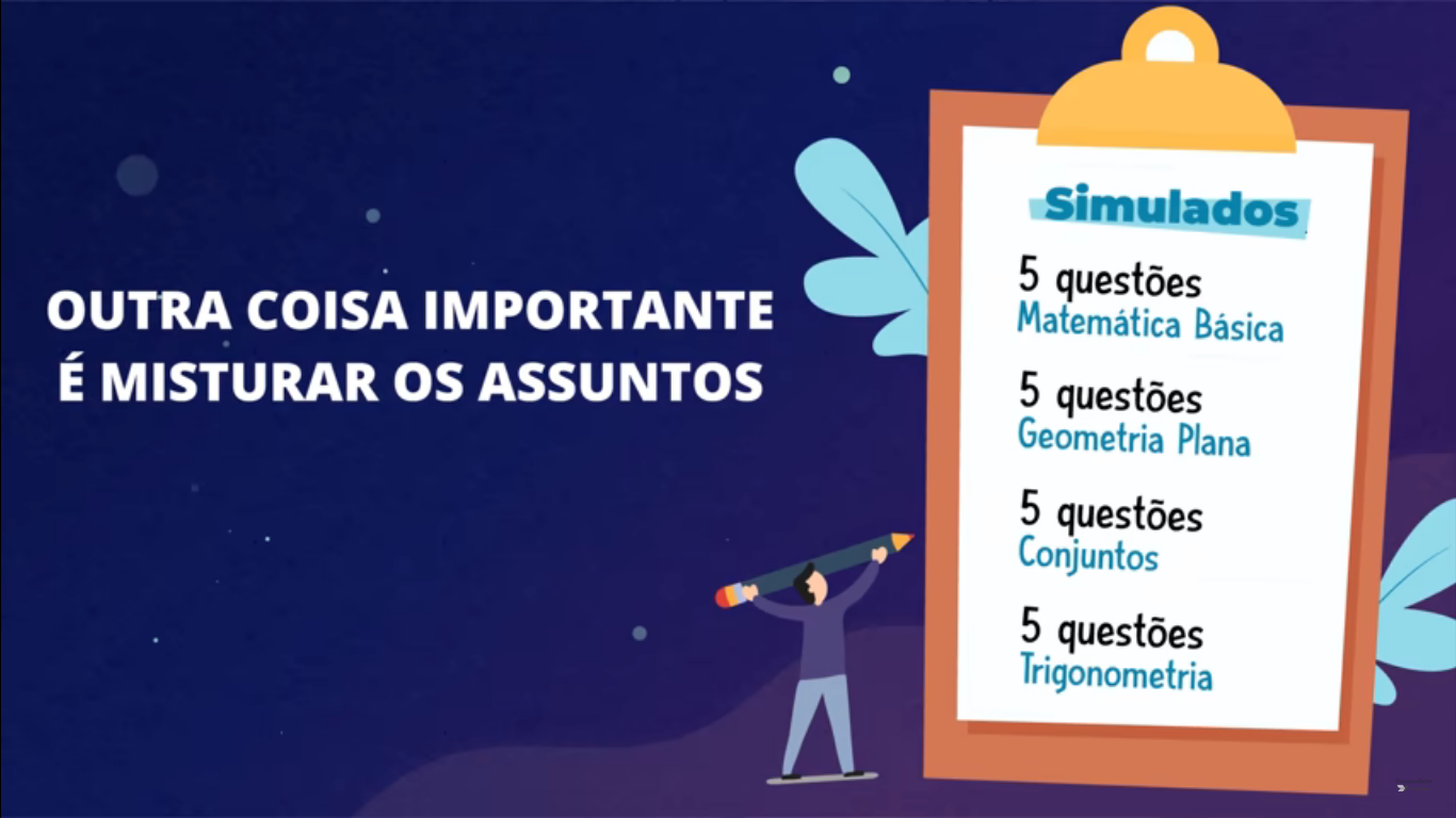 Quando você tá estudando, você faz uma lista de um único assunto e tá tudo muito fresco na memória, você viu uma questão e a outra meio parecida, e não tem tanto desafio! Já quando você vai fazer uma lista e tá tudo misturado, você tem que pensar qual é o assunto, tem que lembrar muito mais, tem que recordar; e é uma habilidade que vai fortalecer a sua memorização.