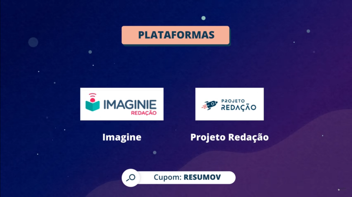 Então não deixa para chegar na prova desesperado, sem fazer redação, porque uma coisa que pode acontecer é você chegar na prova e não ter habilidade de fazer a redação em uma hora, uma hora e meia; e isso roubar tempo das outras questões, então é uma coisa que pode atrapalhar duplamente! Ou fazer uma redação ruim, ou atrapalhar as outras questões; então não dá para ficar sem redação! E duas plataformas que eu indico são: Projeto Redação e o Imagine, e nas duas dá para usar o cupom Resumov.