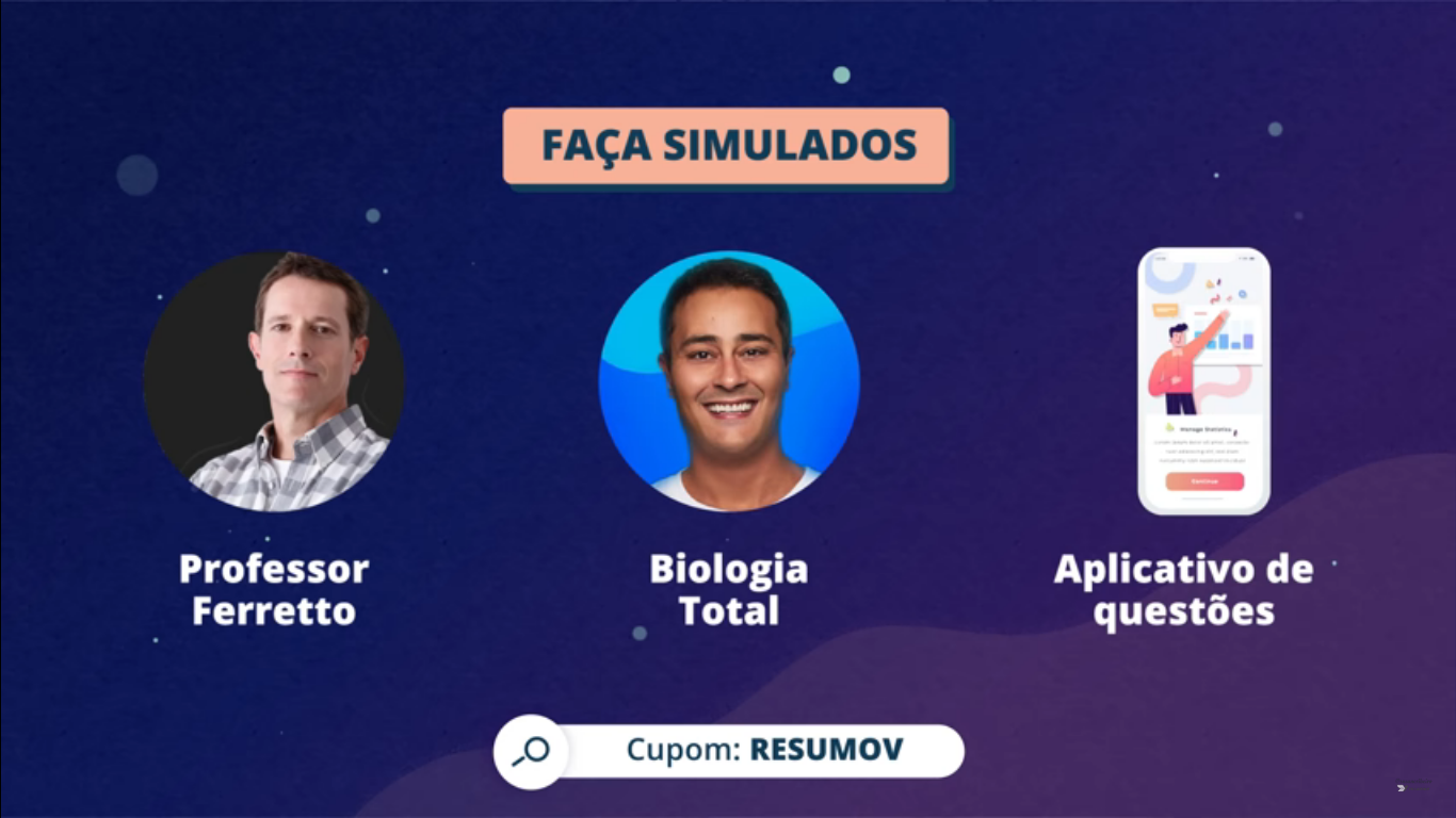 Que é o que vai fazer você ir para outra questão, para outra prova, para outra matéria muito bem; e vai te sustentar positivamente durante toda a prova, eu acho que faz muita diferença, então faça esses simulados. E aí você pode fazer, por exemplo, lá no Ferreto, matemática ou física… Ou no Biologia Total, fazer biologia lá, ou se você tiver um aplicativo de questões também pode fazer nele.