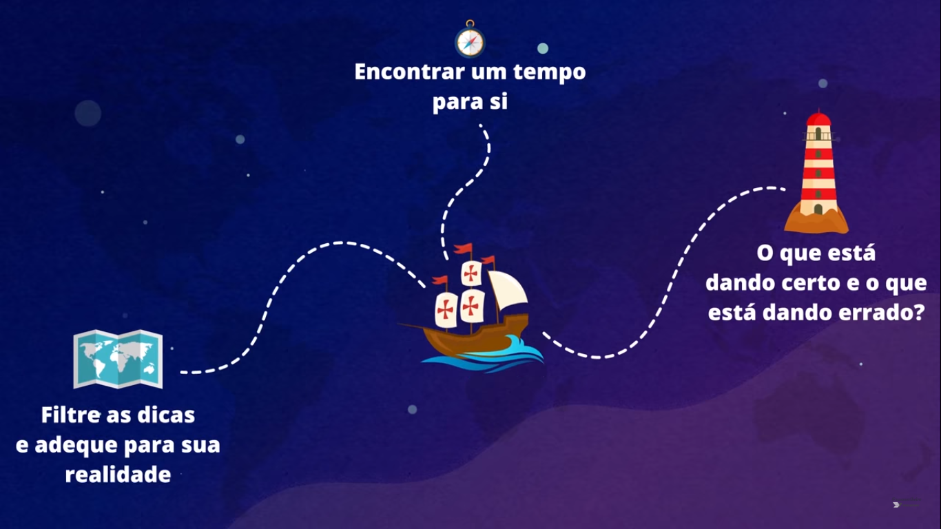 E a segunda parte, vai ser ter um autoconhecimento do que tá dando certo, e do que não está dando certo. Então você tá lá no meio do oceano, como Colombo, e você quer saber como chegar mais rápido nas Índias, como você vai saber isso? Então você vai pensar que tá dando certo, o que não tá dando certo, e pensar em corrigir a rota para ir pra onde você quer. Nos estudos, é legal você sentar um dia e perguntar em cada matéria
