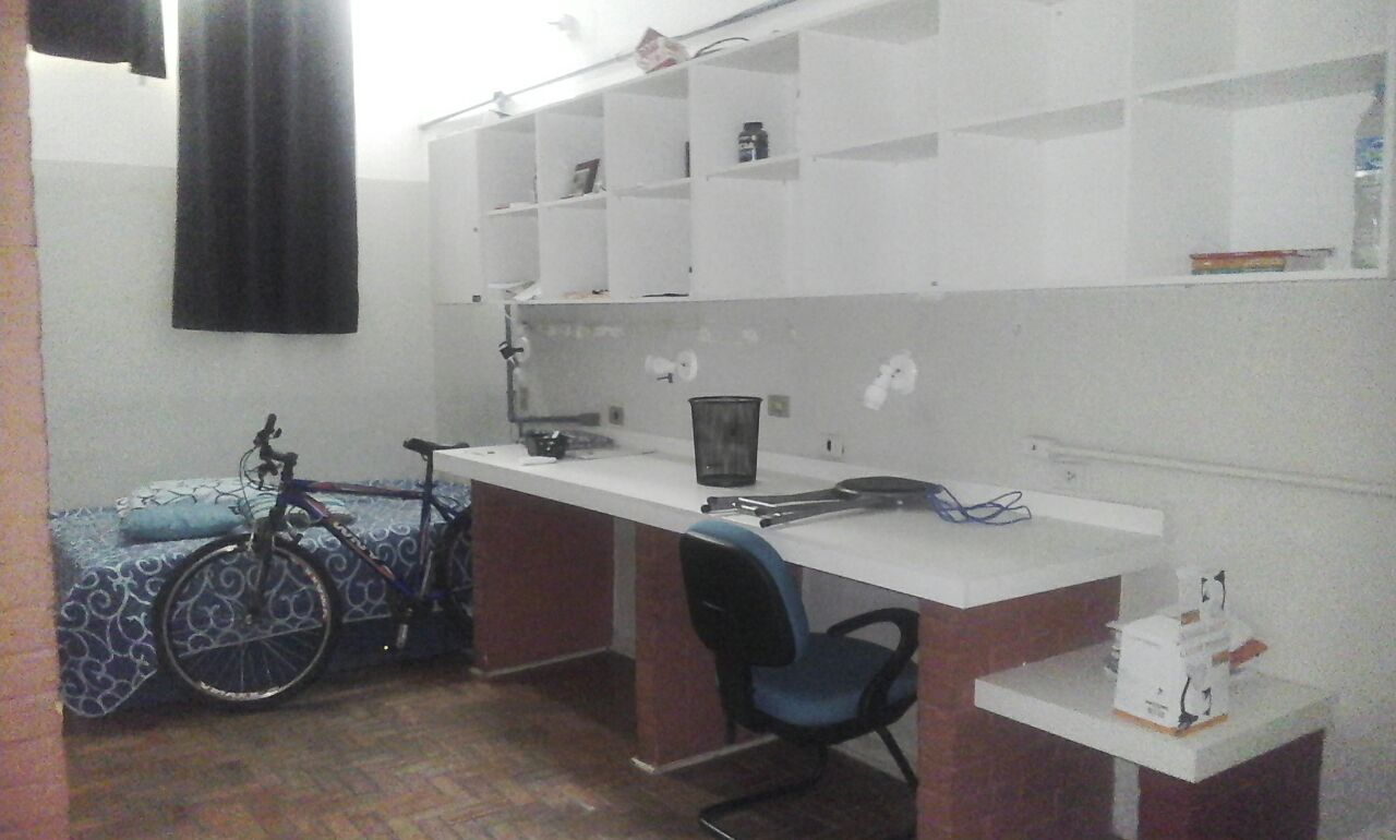 Os apartamentos mais comuns são para 6 pessoas. Aqui uma foto bem real de como é o quarto do H8 para 2 pessoas. Cada um tem sua cama, seu lado da bancada, sua estante e seu guarda-roupa (que não aparece na foto).