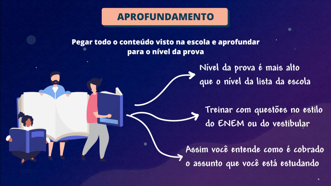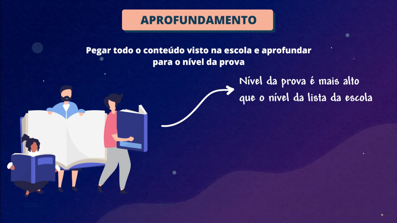 O aprofundamento vai ser basicamente pegar tudo que você tá vendo na escola, você vai aprofundar para o nível da prova, porque uma coisa é o assunto que é dado na sua sala e a lista de exercícios da sua sala, e outra coisa é o nível da prova, então é provável que o nível da prova seja mais alto que o nível da lista de exercício da sua sala.