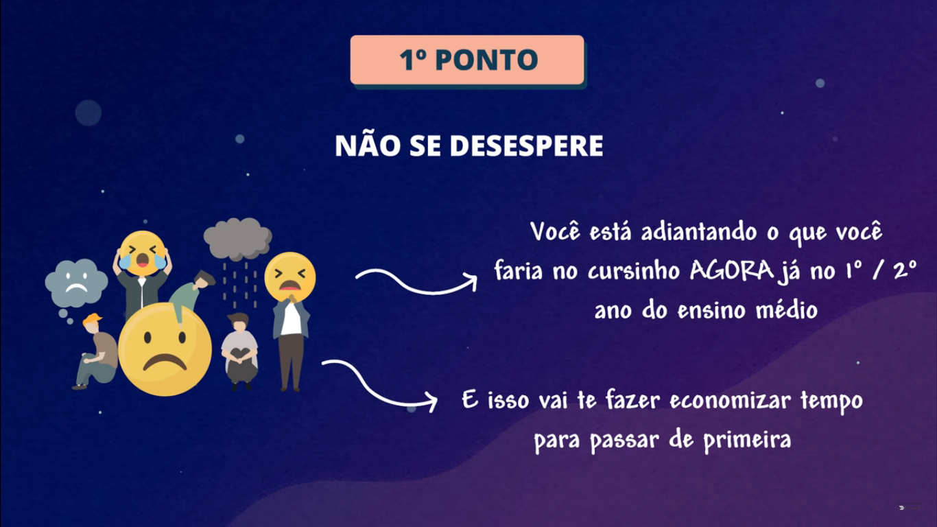 Mas o que que você tá fazendo? Você tá adiantando o que você faria no primeiro ano de cursinho, no segundo ano de cursinho, agora já no primeiro ano, no segundo ano do ensino médio; isso vai te fazer economizar tempo, já quebrar a cabeça agora para passar logo de primeira, porque essa ideia.