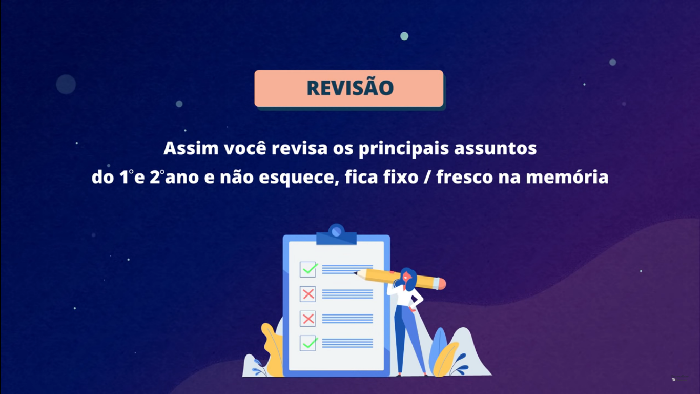 Então a gente não pode deixar isso acontecer, a ideia da revisão é que com o passar do tempo você precisa de menos tempo para relembrar esse assunto, e o assunto fique fresco na sua memória, então isso é muito importante para quem tá no ensino médio, vai ser aprofundamento e revisão, e eu vou te dar uma ideia de como você pode revisar.
