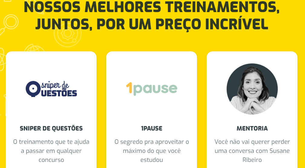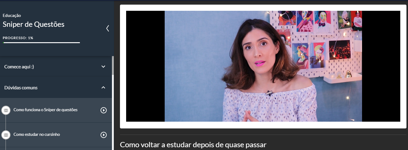 O Sniper de Questões é um curso em videoaulas criado pela Susane Ribeiro, com o intuito de mostrar como estudar da forma mais eficiente possível. Você vai aprender como se preparar e o que fazer para passar nos principais vestibulares do país. O curso se baseia na experiência da Susane estudando para os vestibulares do ITA, Fuvest, Unicamp e também no contato com centenas de alunos que passaram nesses vestibulares.