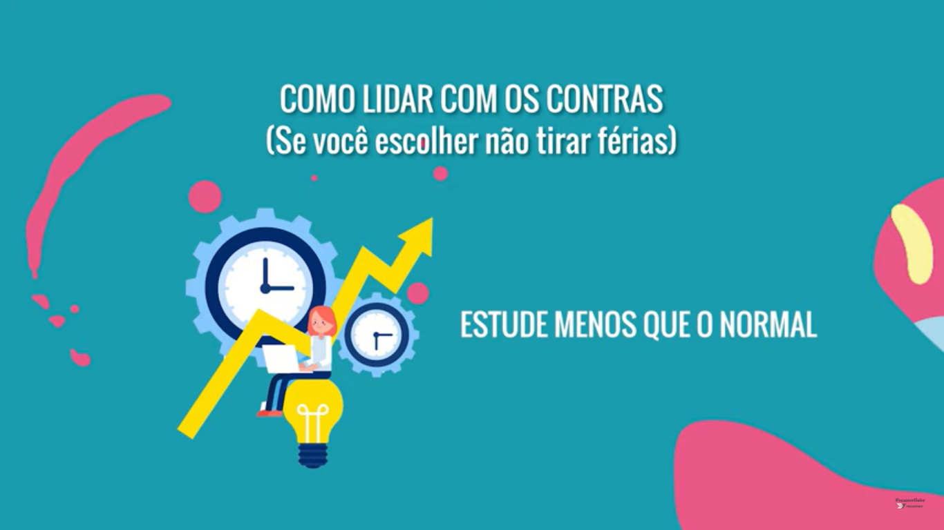 E agora vou falar minha opinião pessoal. Eu acho que é legal tirar uma semana de férias, ou no máximo duas. Aproveitar bastante esse tempo, ser uma férias pra você esquecer mesmo dos livros, esquecer das provas, curtir o momento mesmo.
