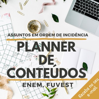 Estude primeiro os assuntos que caem maisPLANNER DE CONTEÚDOS POR INCIDÊNCIA Estude PRIMEIRO os conteúdos mais importantes, aqueles que caem mais nas provas do ENEM e Fuvest. Acompanhe o Planner de conteúdos por incidência e organize o que estudar de cada matéria. Planejamento é essencial Bons estudos! Susane.