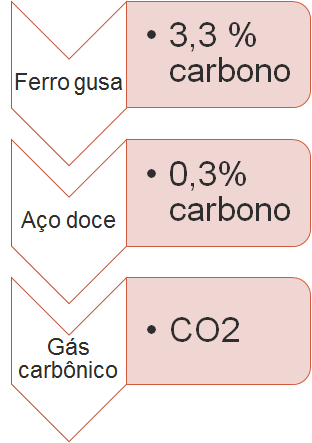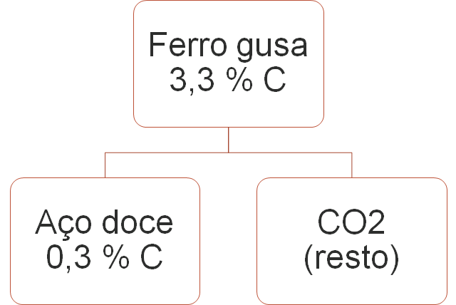 A produção de aço envolve o aquecimento do minério de ferro, junto com carvão (carbono) e ar atmosférico em uma série de reações de oxirredução. O produto é chamado de ferro-gusa e contém cerca de 3,3% de carbono. Uma forma de eliminar o excesso de carbono é a oxidação a partir do aquecimento do ferro-gusa com gás oxigênio puro. Os dois principais produtos formados são aço doce (liga de ferro com teor de 0,3% de carbono restante) e gás carbônico. As massas molares aproximadas dos elementos carbono e oxigênio são, respectivamente, 12 g/mol e 16 g/mol.