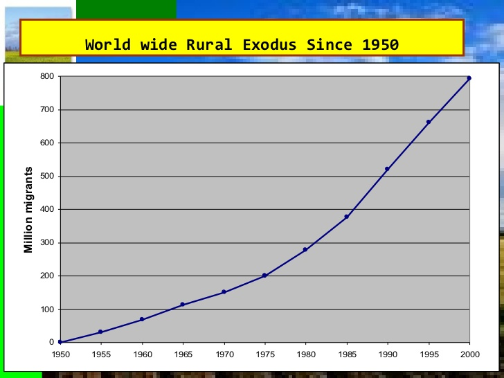 Os migrantes rurais também experimentam freqüentemente condições de vida precárias. Muitas cidades explodiram em população; serviços e infra-estrutura, nessas cidades, são incapazes de acompanhar o crescimento populacional. Os influxos maciços na população rural podem levar a uma grave escassez de habitação, à falta de abastecimento de água e energia e a condições gerais de favela nas cidades. O êxodo rural foi um forte fator para o crescimento das favelas e das periferias das cidades grandes.