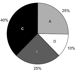 Foi realizado um levantamento nos 200 hotéis de uma cidade, no qual foram anotados os valores, em reais, das diárias para um quarto padrão de casal e a quantidade de hotéis para cada valor da diária. Os valores das diárias foram: A = R$ 200,00; B = R$ 300,00; C = R$ 400,00 e D = R$ 600,00. No gráfico, as áreas representam as quantidades de hotéis pesquisados, em porcentagem, para cada valor da diária.