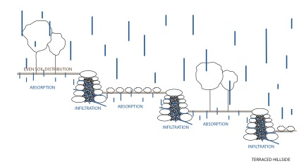 Este método de agricultura usa “degraus” que são incorporados ao lado de uma montanha ou colina. Em cada nível, várias culturas são plantadas. Quando chove, em vez de lavar todos os nutrientes no solo, os nutrientes são levados para o próximo nível. Além disso, esses degraus impedem uma avalanche de água que poderia destruir todas as culturas da encosta. Este sistema também permitiu construir aquedutos, que levavam água a cada nível.