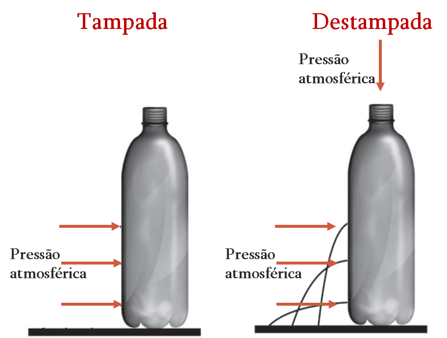 Como a pressão atmosférica interfere no escoamento da água, nas situações com a garrafa tampada e destampada, respectivamente?