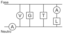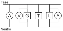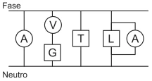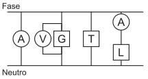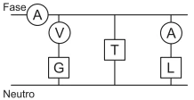 Um eletricista analisa o diagrama de uma instalação elétrica residencial para planejar medições de tensão e corrente em uma cozinha. Nesse ambiente existem uma geladeira (G), uma tomada (T) e uma lâmpada (L), conforme a figura. O eletricista deseja medir a tensão elétrica aplicada à geladeira, a corrente total e a corrente na lâmpada. Para isso, ele dispõe de um voltímetro (V) e dois amperímetros (A).