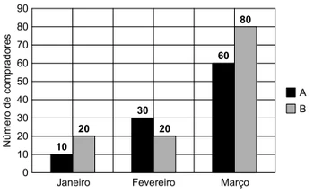Uma loja acompanhou o número de compradores de dois produtos, A e B, durante os meses de janeiro, fevereiro e março de 2012. Com isso, obteve este gráfico: