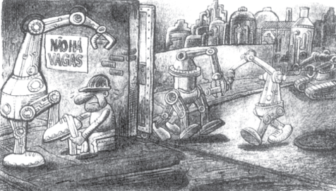 Considerando-se a dinâmica entre tecnologia e organização do trabalho, a representação contida no cartum é caracterizada pelo pessimismo em relação à