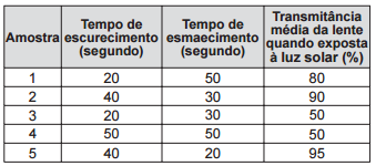 Durante um teste de controle para o desenvolvimento de novas lentes fotocromáticas, foram analisadas cinco amostras, que utilizam reagentes químicos diferentes. No quadro, são apresentados os resultados.