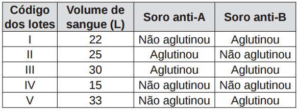 Em um hospital havia cinco lotes de bolsas de sangue, rotulados com os códigos I, II, III, IV e V. Cada lote continha apenas um tipo sanguíneo não identificado. Uma funcionária do hospital resolveu fazer a identificação utilizando dois tipos de soro, anti-A e anti-B. Os resultados obtidos estão descritos no quadro.