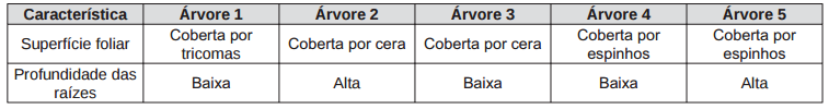 Uma região de Cerrado possui lençol freático profundo, estação seca bem marcada, grande insolação e recorrência de incêndios naturais. Cinco espécies de árvores nativas, com as características apresentadas no quadro, foram avaliadas quanto ao seu potencial para uso em projetos de reflorestamento nessa região.