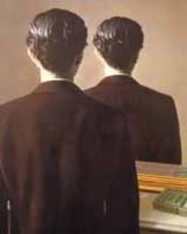 Veja que o quadro de Magritte seria um espelho às avessas. O “reflexo” visto no espelho na verdade é as suas costas. Parece uma lógica absurda, aí está o surrealismo.