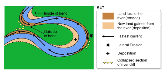 3 – Meandros – Os dois lados do rio sofrem erosão e depósito de detritos.