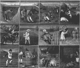Os calendários são fontes históricas importantes, na medida em que expressam a concepção de tempo das sociedades. Essas imagens compõem um calendário medieval (1460-1475) e cada uma delas representa um mês, de janeiro a dezembro. Com base na análise do calendário, apreende-se uma concepção de tempo