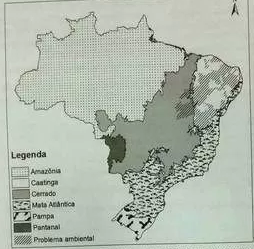 No mapa estão representados os biomas brasileiros que, em função de suas características físicas e do modo de ocupação do território, apresentam problemas ambientais distintos. Nesse sentido, o problema ambiental destacado no mapa indica.