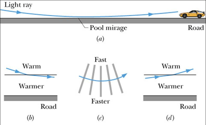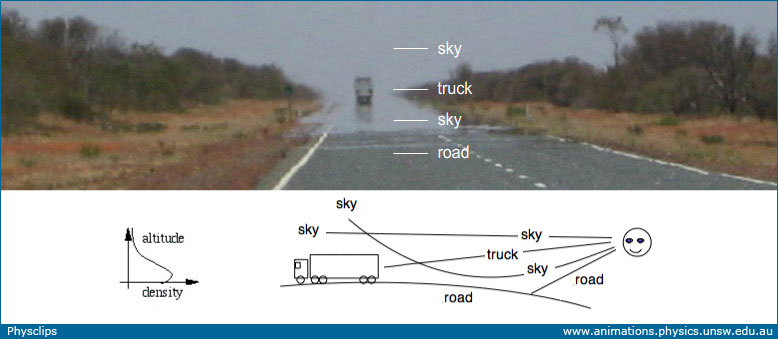 Este fenômeno óptico ocorre porque os raios de luz são “dobrados” quando passam através das camadas de ar de diferentes temperaturas, elas tem coeficientes de refração diferente, ou seja, a luz se propaga com velocidades diferentes em cada meio, e nos dá a impressão de que os objetos estão “flutuando”, assim como a piscina parece estar mais rasa.