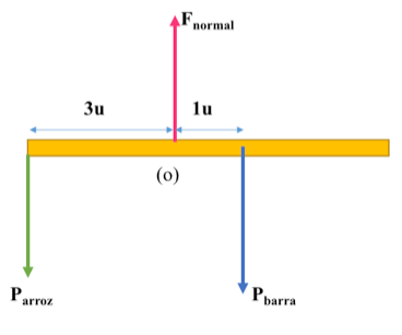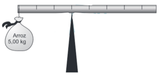 Em um experimento, um professor levou para a sala de aula um saco de arroz, um pedaço de madeira triangular e uma barra de ferro cilíndrica e homogênea. Ele propôs que fizessem a medição da massa da barra utilizando esses objetos. Para isso, os alunos fizeram marcações na barra, dividindo-a em oito partes iguais, e em seguida apoiaram-na sobre a base triangular, com o saco de arroz pendurado em uma de suas extremidades, até atingir a situação de equilíbrio.