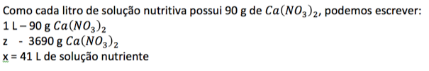 A hidroponia pode ser definida como uma técnica de produção de vegetais sem necessariamente a presença de solo. Uma das formas de implementação é manter as plantas com suas raízes suspensas em meio líquido, de onde retiram os nutrientes essenciais. Suponha que um produtor de rúcula hidropônica precise ajustar a concentração de íon nitrato (NO –) para 0,009 mol/L em 3 um tanque de 5000 litros e, para tanto, tem em mãos uma solução comercial nutritiva de nitrato de cálcio 90 g/L. As massas molares dos elementos N, O e Ca são iguais a 14 g/mol, 16 g/mol e 40 g/mol, respectivamente.