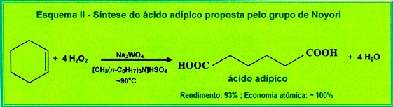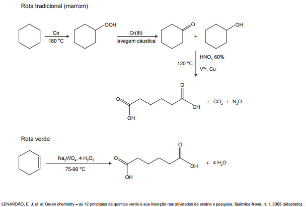 A química verde permite o desenvolvimento tecnológico com danos reduzidos ao meio ambiente, e encontrar rotas limpas tem sido um grande desafio. Considere duas rotas diferentes utilizadas para a obtenção de ácido adípico, um insumo muito importante para a indústria têxtil e de plastificantes.