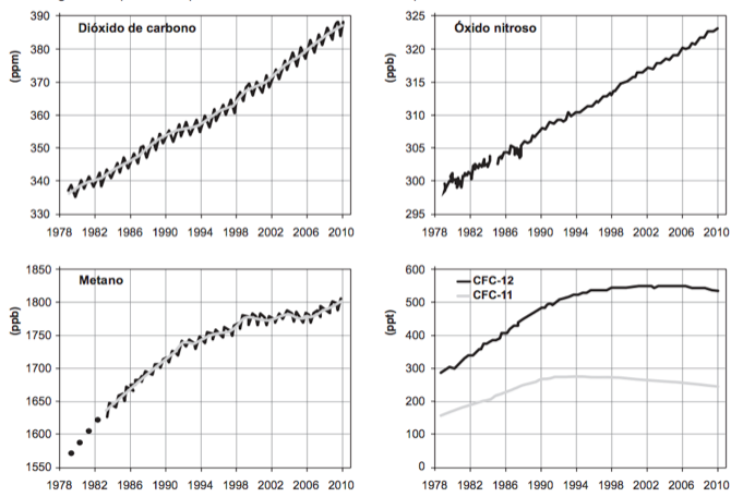 Os gráficos representam a concentração na atmosfera, em partes por milhão (ppm), bilhão (ppb) ou trilhão (ppt), dos cinco gases responsáveis por 97% do efeito estufa durante o período de 1978 a 2010.